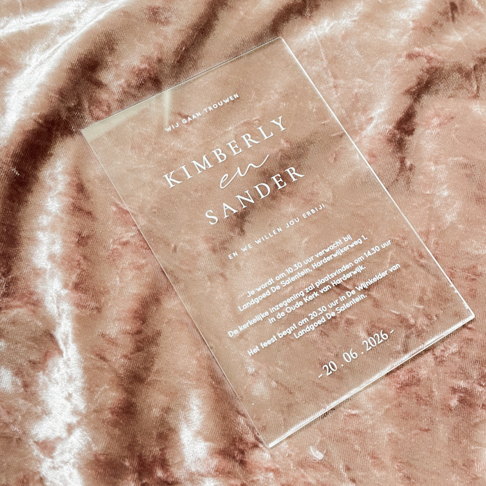 Prachtige acryl trouwkaart, transparant met witte tekst. Je kunt deze kaart helemaal naar wens aanpassen en een proefdruk bestellen!
