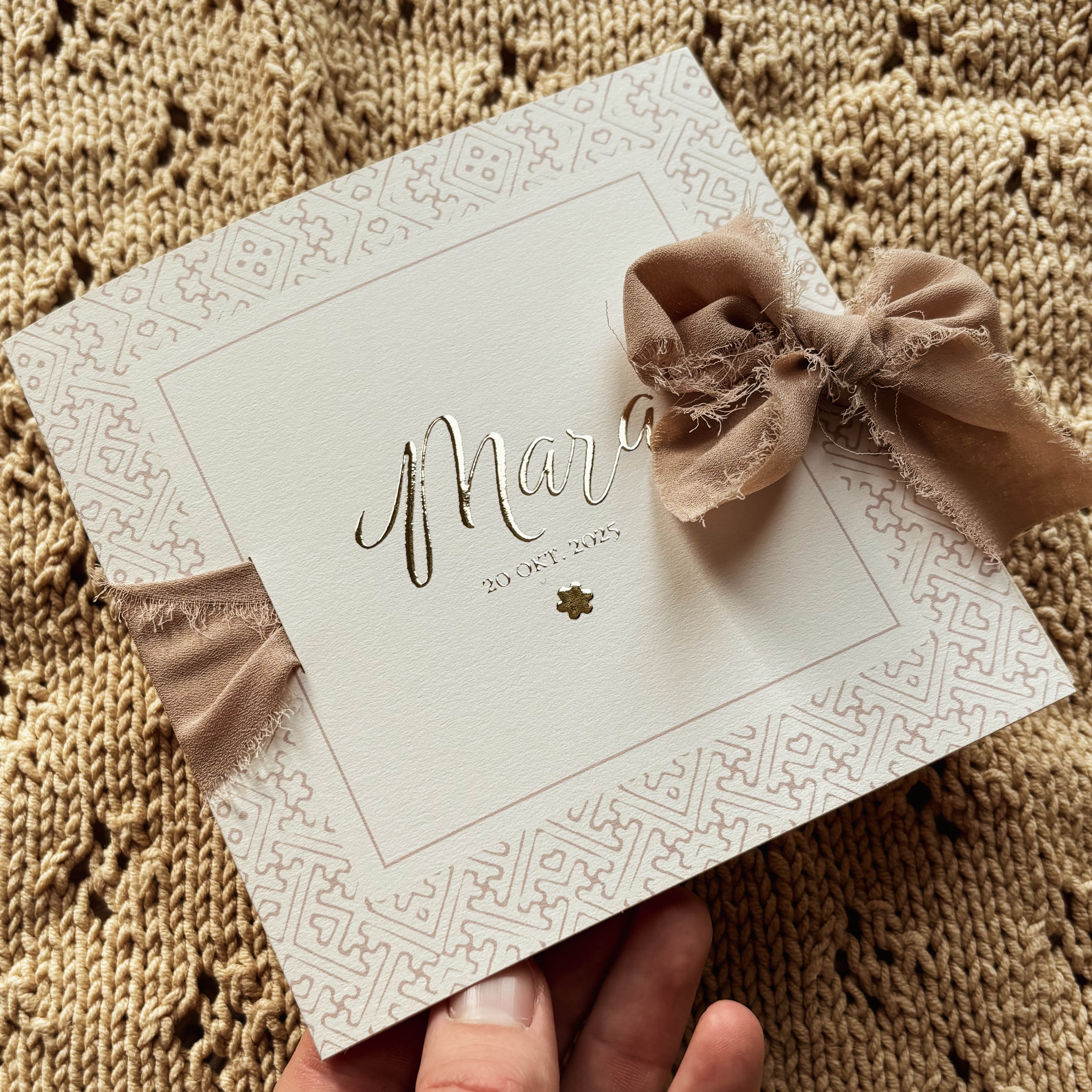 Chique meisjes geboortekaartje met goudfolie. Je kunt deze kaart helemaal naar wens aanpassen in de online editor. Let op: kaartje wordt geleverd zonder lint. Je kan dit bij bestellen via www.lindesigned.nl/touwtjes
