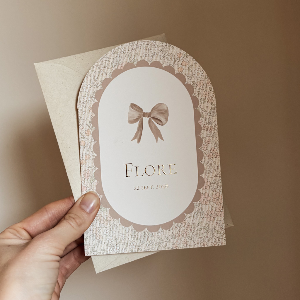 Vintage geboortekaartje voor een meisje met strikje en goudfolie. Pas het ontwerp naar wens aan in de online editor. Meisjesnaam Flore.