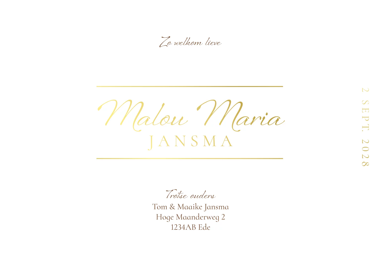 Minimalistisch wit met goud geboortekaartje voor een meisje met twee gaatjes voor een strikje.