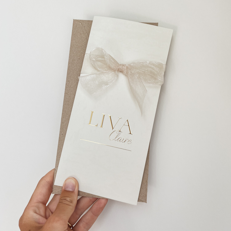 Lief langwerpig geboortekaartje voor een meisje. Het kaartje heeft een beige achtergrond en is voorzien van goudfolie. Let op: De kaart wordt geleverd zonder lint. Je kunt het lint: Organza zand zoals op de foto bijbestellen via de volgende link: https://lindesigned.nl/mooie-lintjes