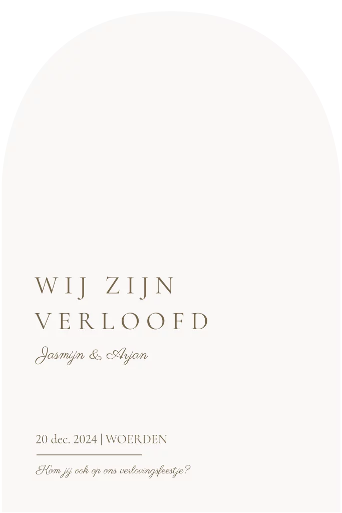 Boogvorm save the date in beige met bruin en een sierlijk lettertype. Pas het ontwerp helemaal naar wens aan!