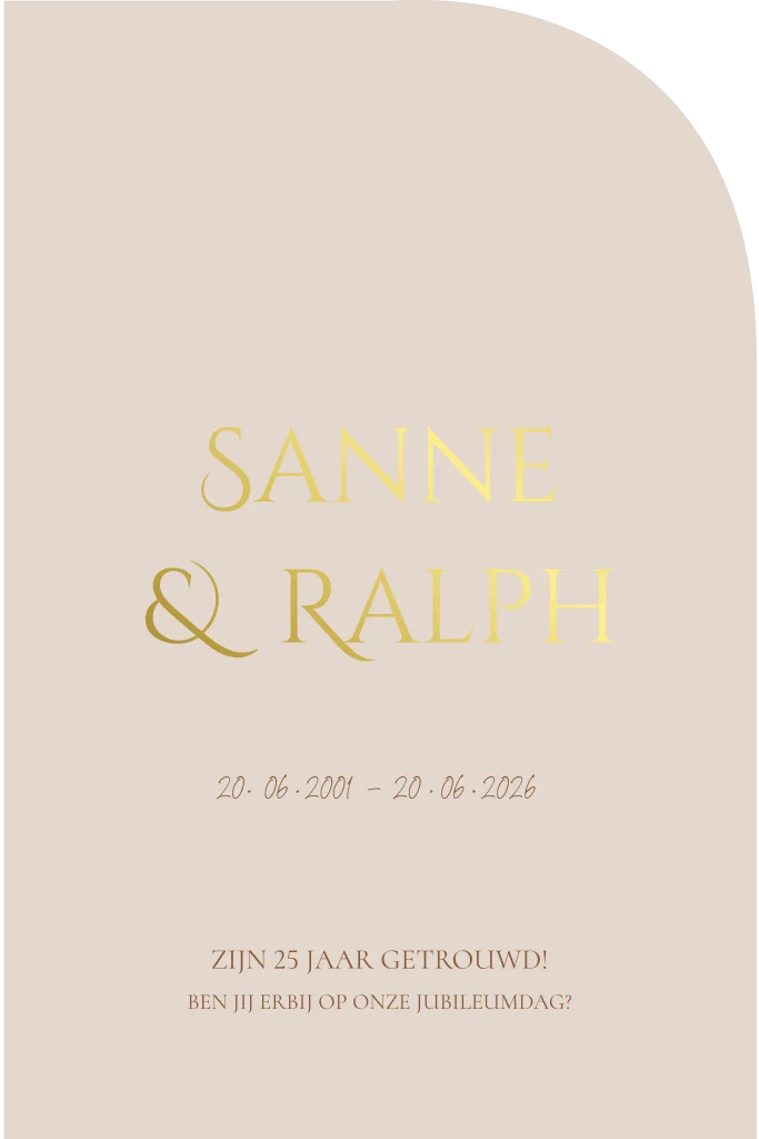 Chique strakke jubileumkaart in beige / zandkleur met goudfolie. Je kunt deze jubileumkaart helemaal naar wens aanpassen in de online editor.