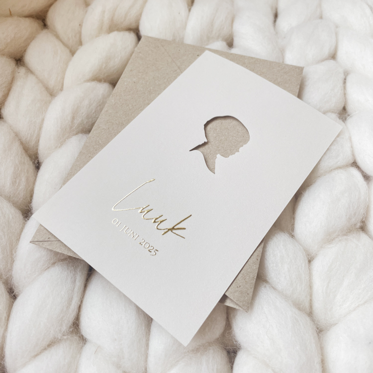 Lief geboortekaartje voor een jongetje met een silhouet van een jongens gezicht. Pas het kaartje naar wens aan!