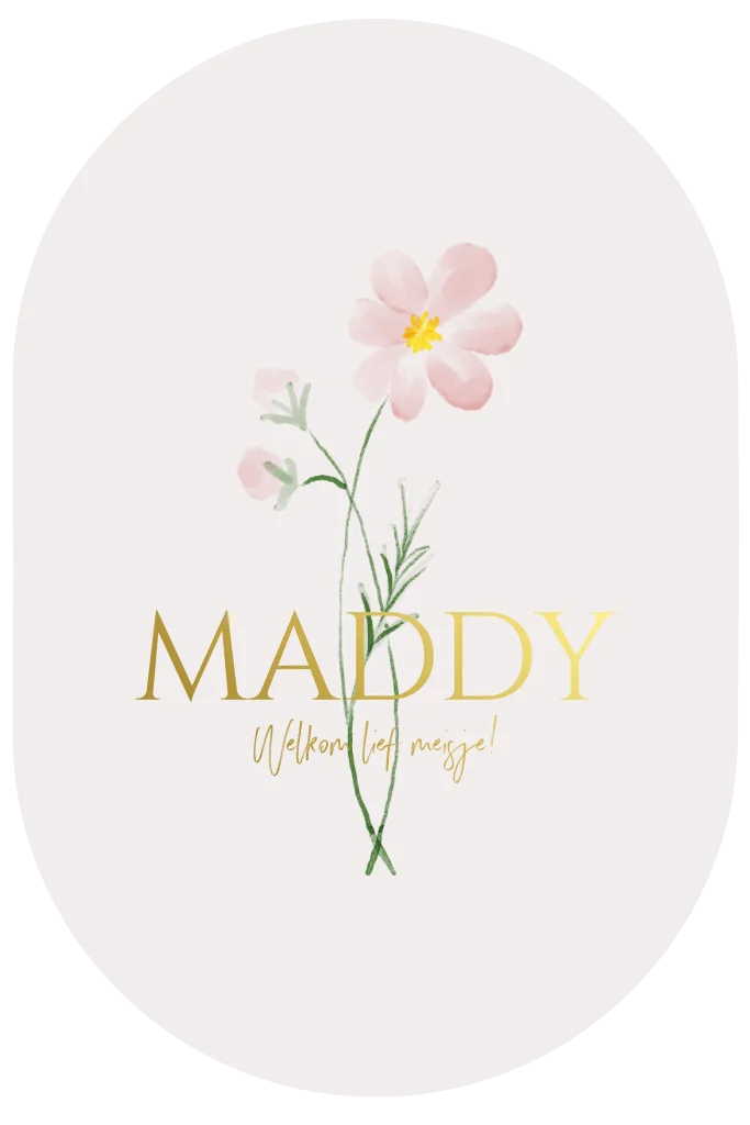 Een ovaal geboortekaarje met de geboortebloem van april: het madeliefje.
