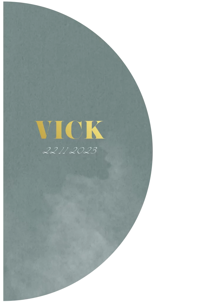 Half rond geboortekaartje met groene achtergrond en goudfolie. Lief geboortekaartje in bijzondere vorm voor een jongetje. Jongensnaam Vick