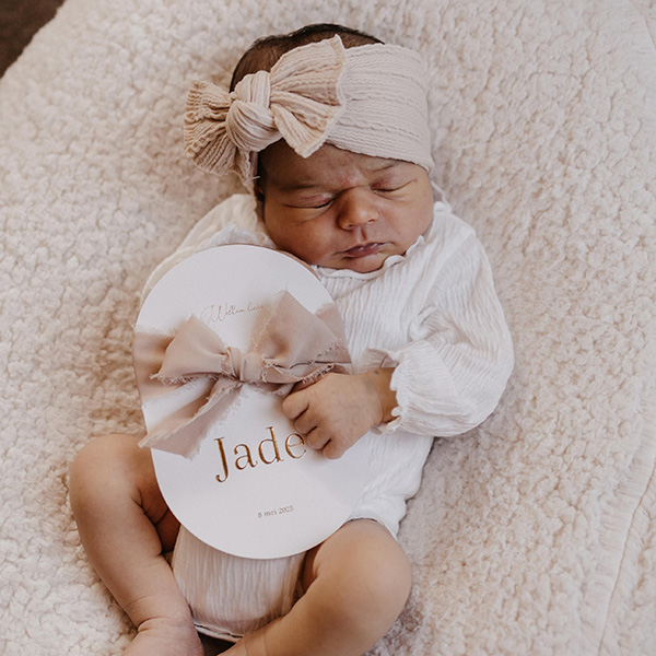 Ovaal geboortekaartje met goudfolie en strik
