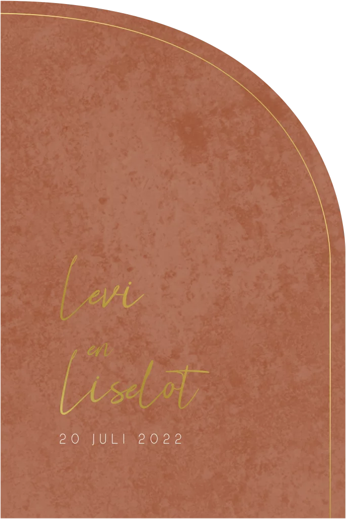 Roestkleur trouwkaart met velvet achtergrond en goudfolie. De trouwkaart is in een mooie vorm gestanst.