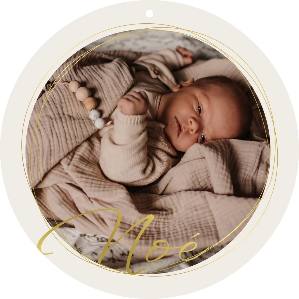 Feestelijk rond geboortekaartje voor een meisje. Leuk om in de periode rond kerst te versturen. Dit kaartje wordt geleverd zonder lint maar dit kan je wel online of via de mail bestellen!