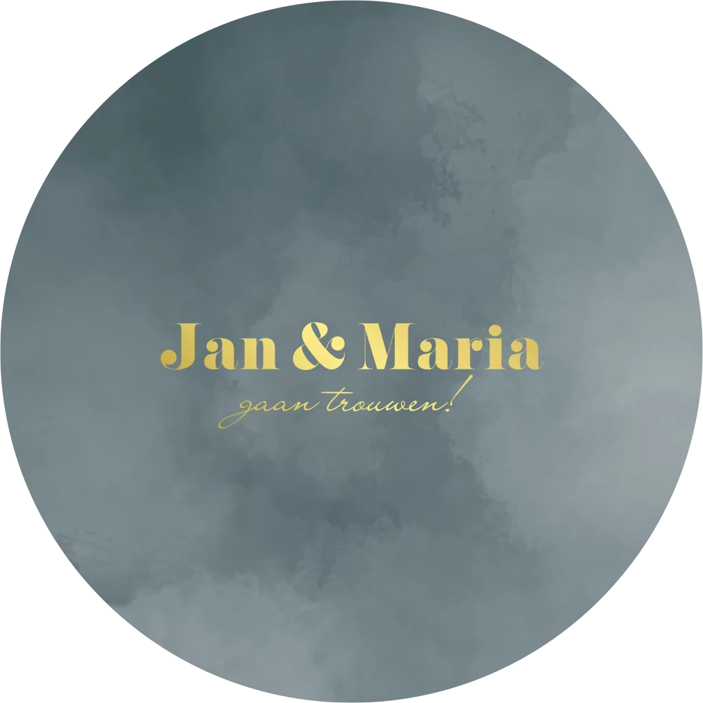 Ronde trouwkaart met de namen van het bruidspaar in goudfolie en een gevlekte velvetlook achtergrond. Mooie grijsblauwe look.