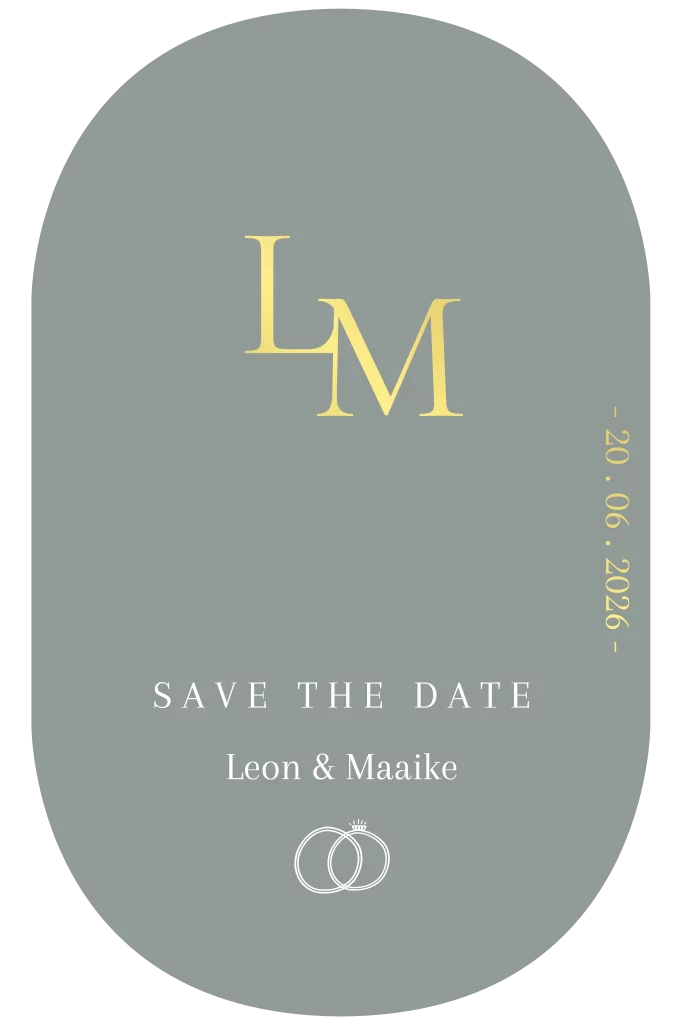 Ovalen save the date in groen met goudfolie. Je kunt deze helemaal naar wens aanpassen in de online editor.