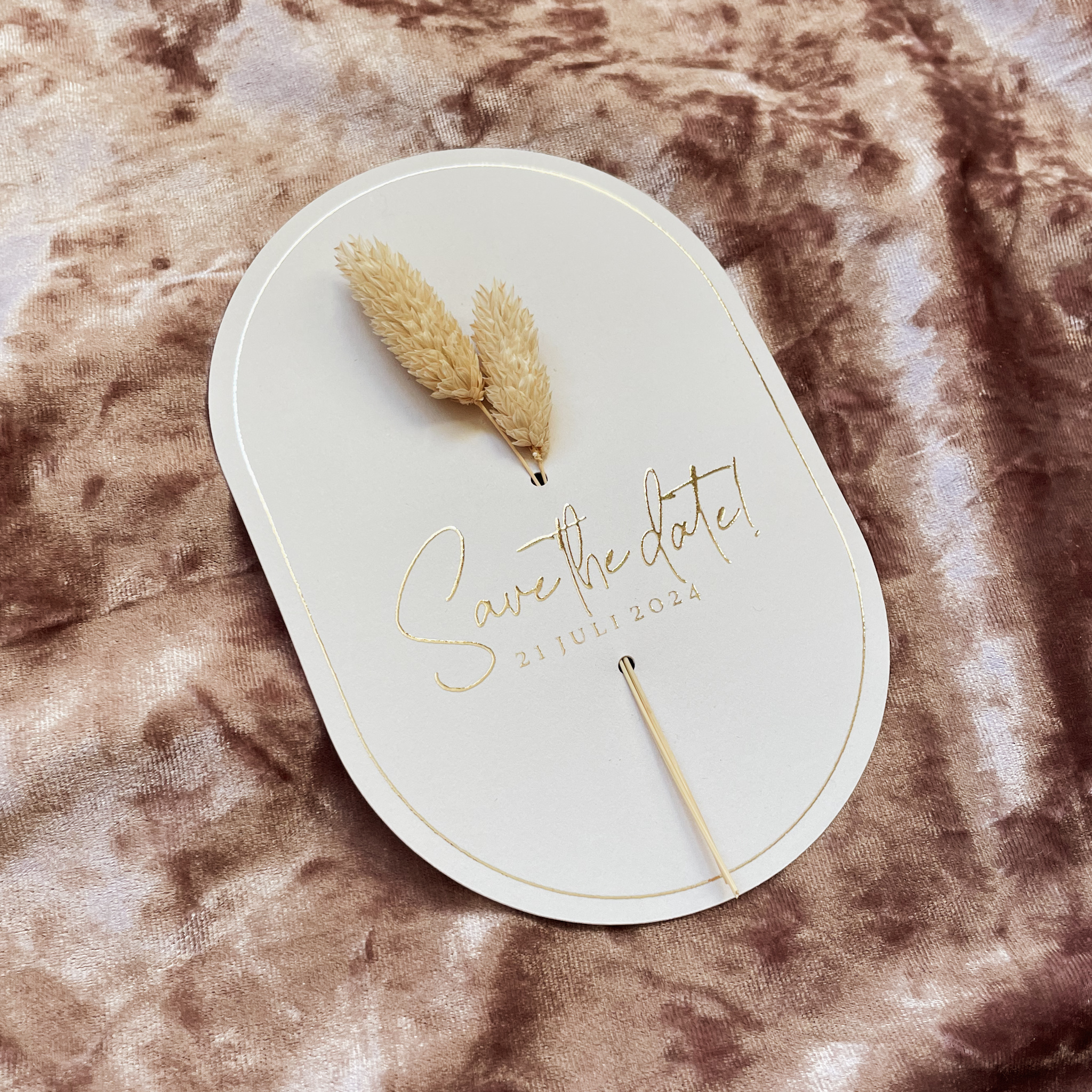 Ovalen save the date zandkleur met takjes voor bloemetjes. Met goudfolie. Let op: De kaart wordt geleverd zonder het takje. Je kunt het takje zoals op de foto bijbestellen via de volgende link: https://lindesigned.nl/takjes-bestellen