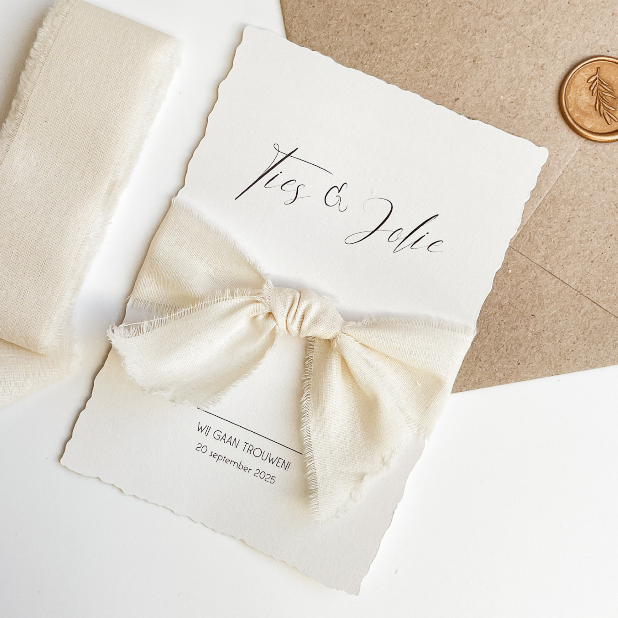 Chique trouwkaart met scheprand en een beige achtergrondkleur.