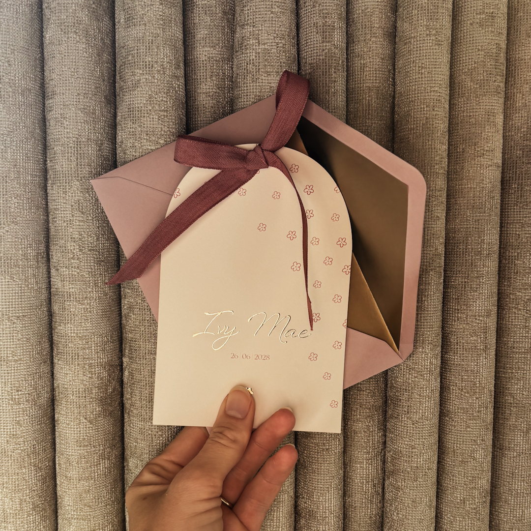 Een prachtig geboortekaartje met een beige achtergrond en lieve, handgetekende bloemetjes. Je kunt deze kaart helemaal naar wens aanpassen in de online editor. Let op: wordt geleverd zonder lint. Je kunt dit bestellen via www.lindesigned.nl/mooie-lintjes