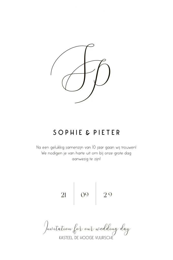 Een prachtige trouwkaart met een witte achtergrond en zwarte initialen. De kaart is helemaal naar wens aan te passen in de online editor! Perfect voor een minimalistische bruiloft met trendkleuren wit, goud en zwart.
