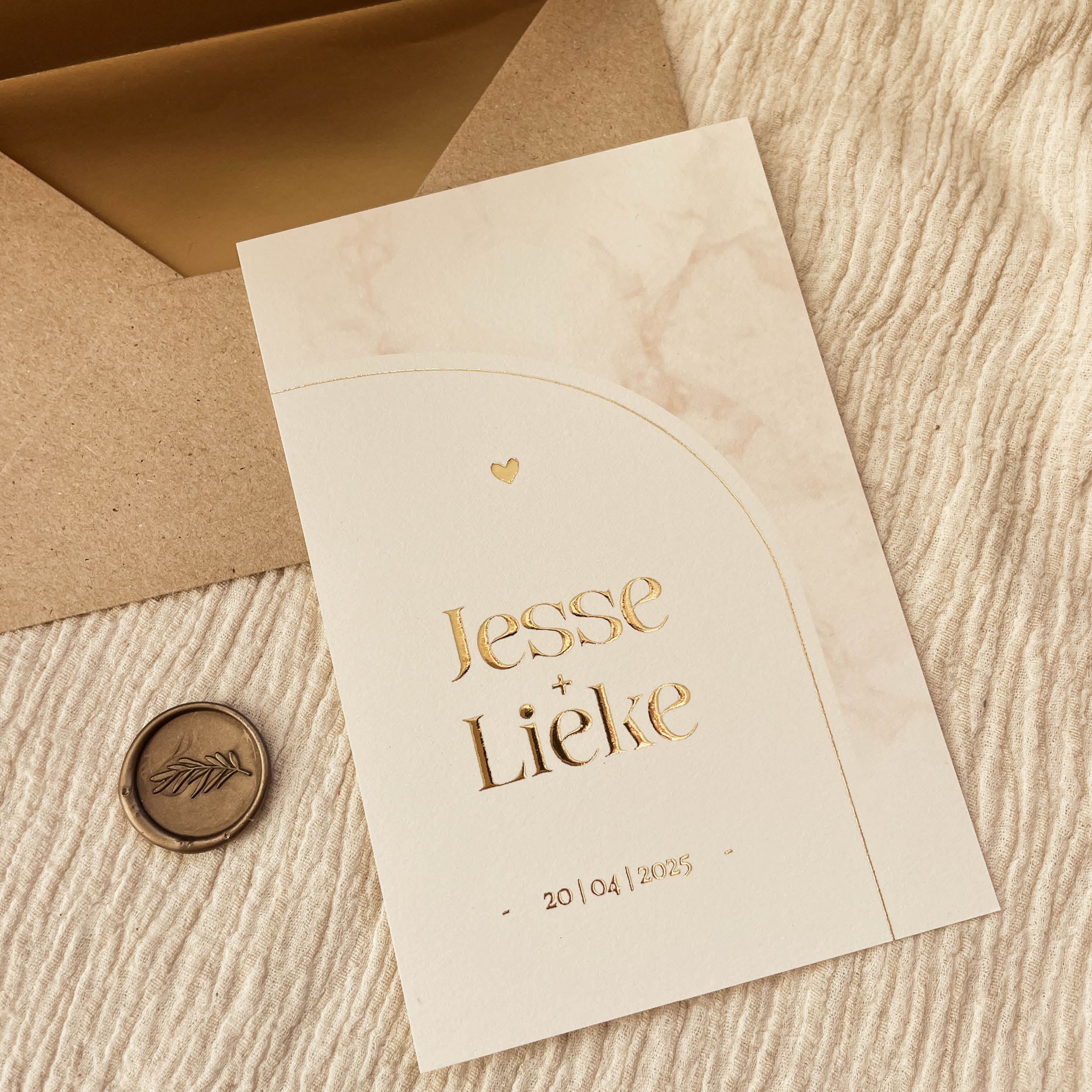 Zandkleur marmerlook trouwkaart met goudfolie
