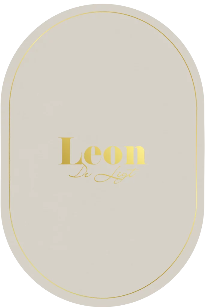 Zand ovaal geboortekaartje met goudfolie naam Leon en de achternaam. Geboortekaartje in bijzondere vorm.
