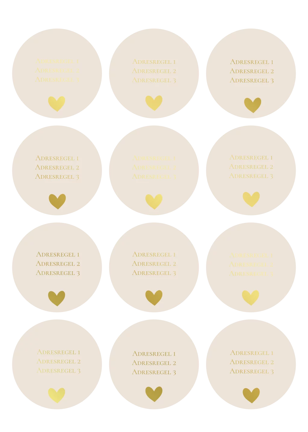 Ronde beige adresetiketten met goudfolie en een hartje. Pas de etiketten naar wens aan in de online editor.