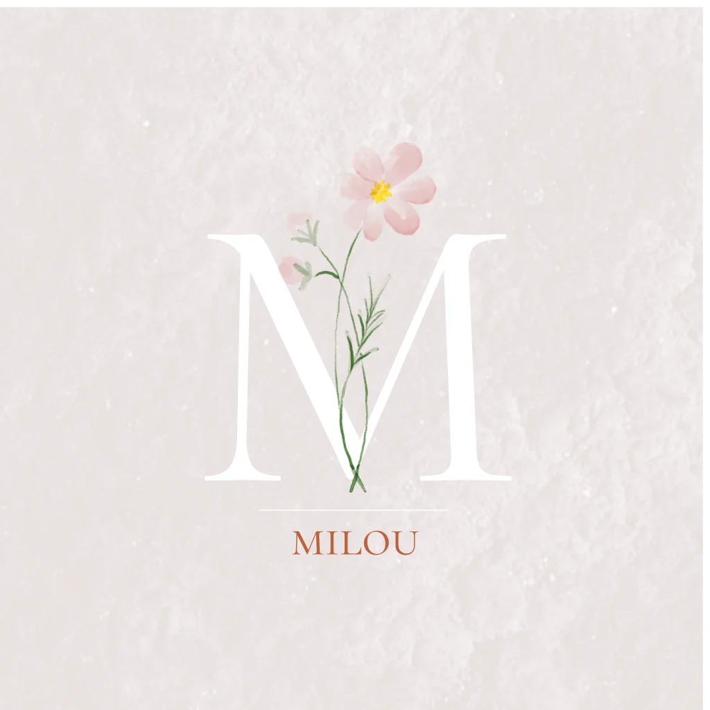 Zandkleur raambord met een wit initiaal en de meisjesnaam Milou in roestkleur. Dit raambord is voorzien van een roze cosmea; de geboortebloem van oktober. Maar je kunt het bord natuurlijk ook in andere maanden aan het raam hangen!
