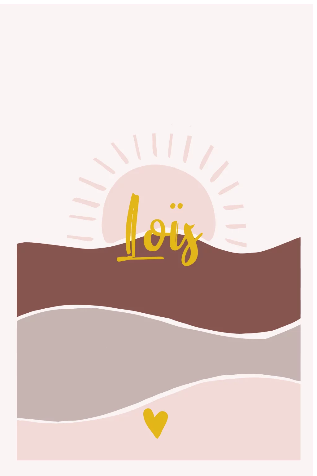 Mooi raambord of geboortebord met een roze zon, roestkleur achtergrond en de naam in goud.