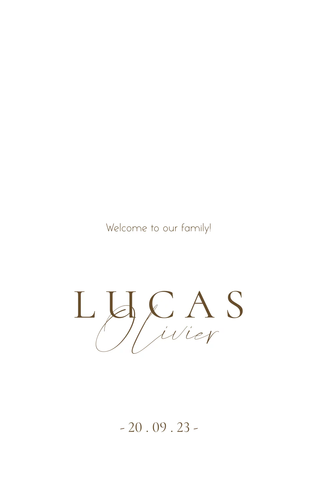 Raambord wit met bruine tekst. Je kan dit geboortebord ook omzetten naar een meisjesvariant door de namen te wijzigen.