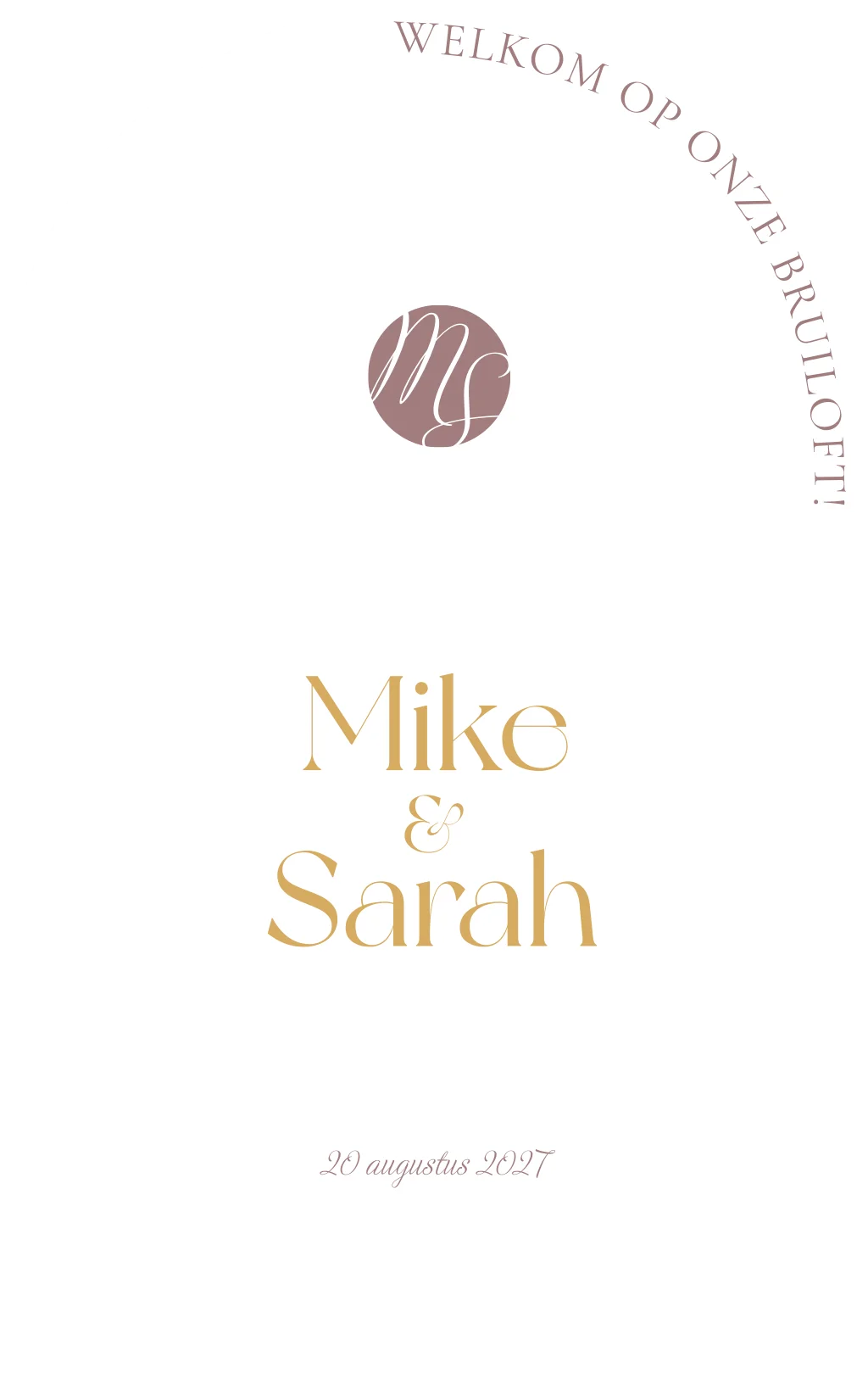 Mooi welkomstbord in wit met gouden letters en mauve tekst. Pas het bord naar wens aan in de online editor!
