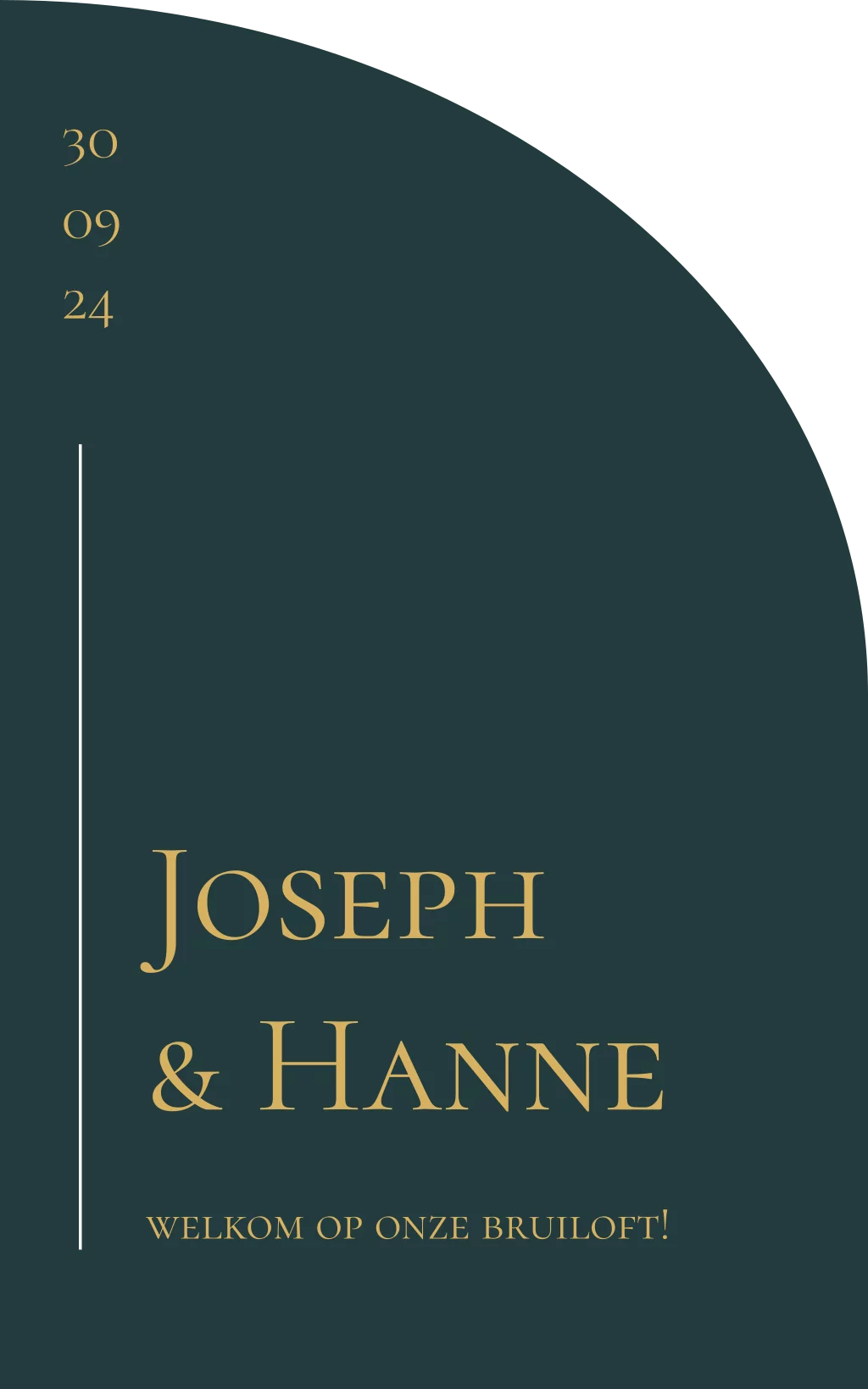 Chique donkergroen bruiloftsbord met gouden letters en streep. Met halve boogvorm.