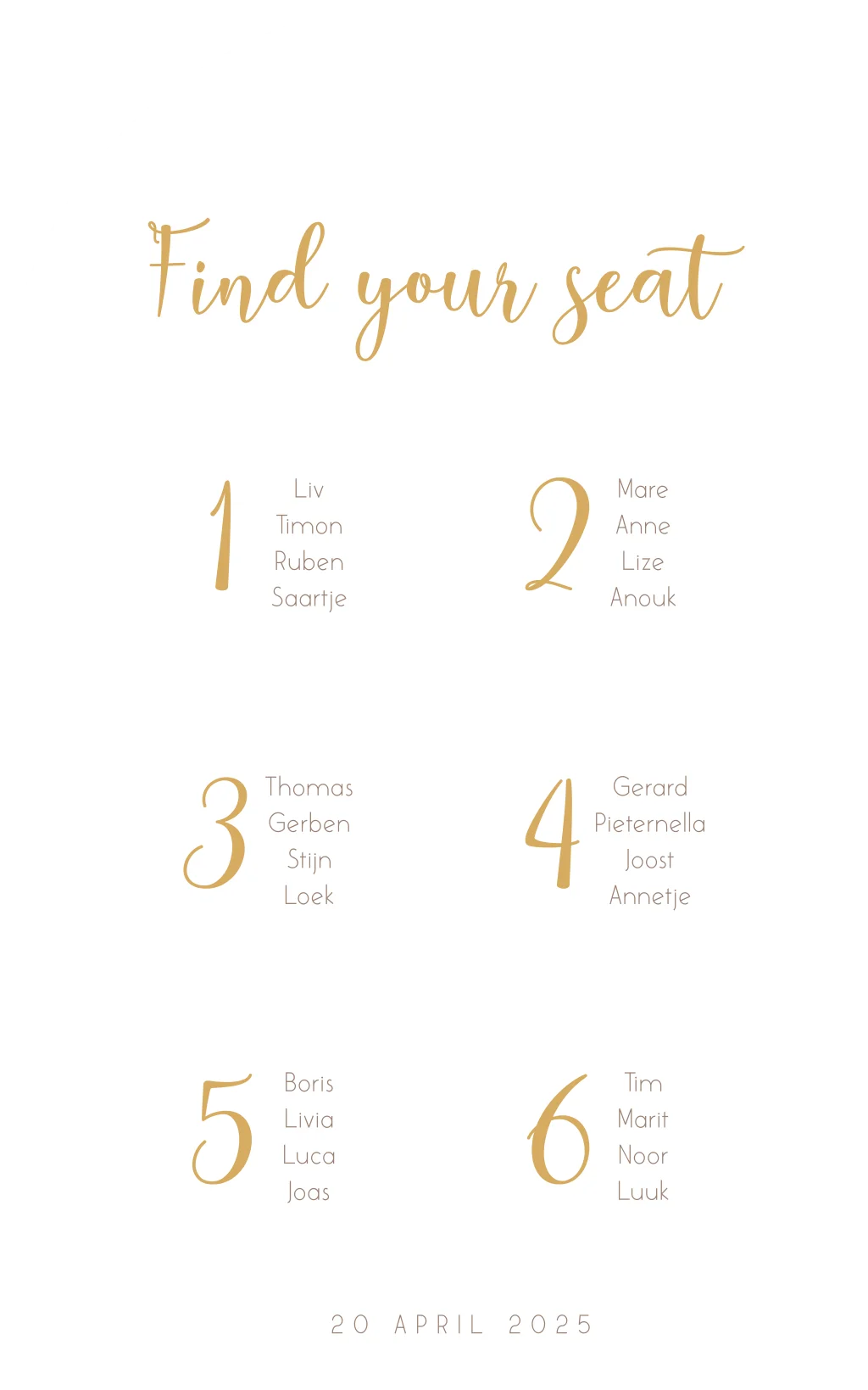 Laat je tafelindeling perfect matchen met je trouwkaart en help gasten moeiteloos hun stoel te vinden. In de online editor pas je alles eenvoudig naar wens aan.