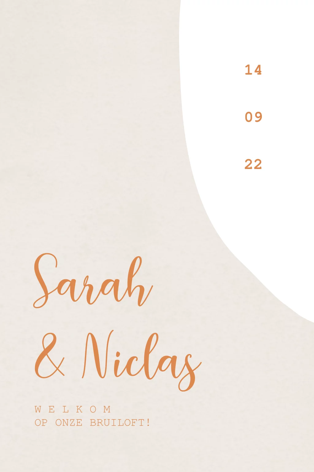 Bruiloft tuinbord met abstracte vorm en koperen tekst. Bijbehorende dagplanning beschikbaar.