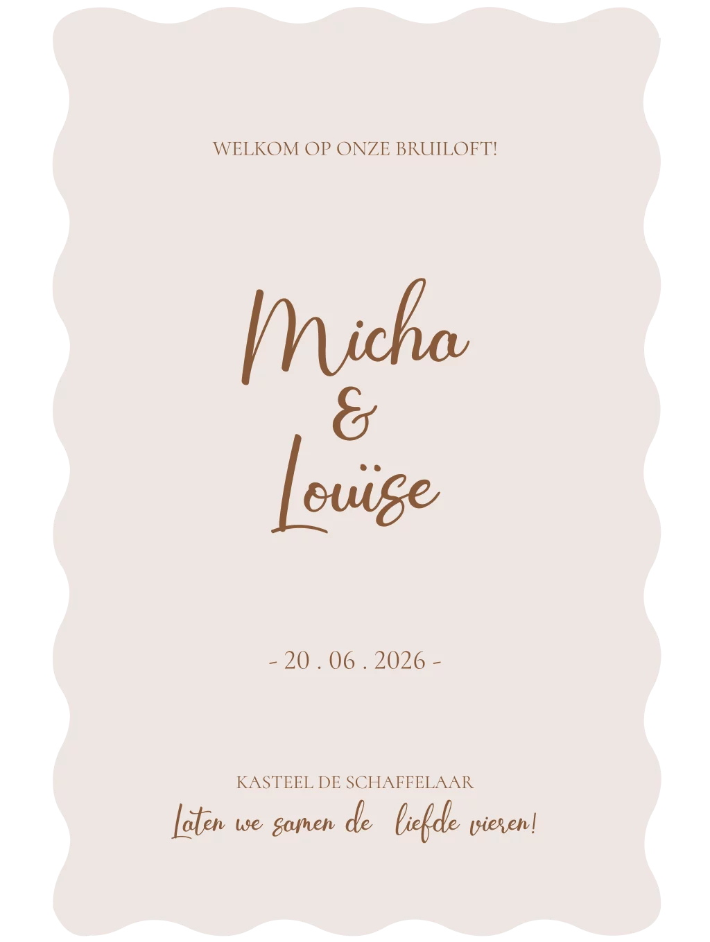Mooi welkomstbord in een golvenvorm. Je kunt ook dit welkomstbord voor je bruiloft helemaal naar wens aanpassen in de online editor. Verkrijgbaar met bijpassende trouwkaart/save the date.