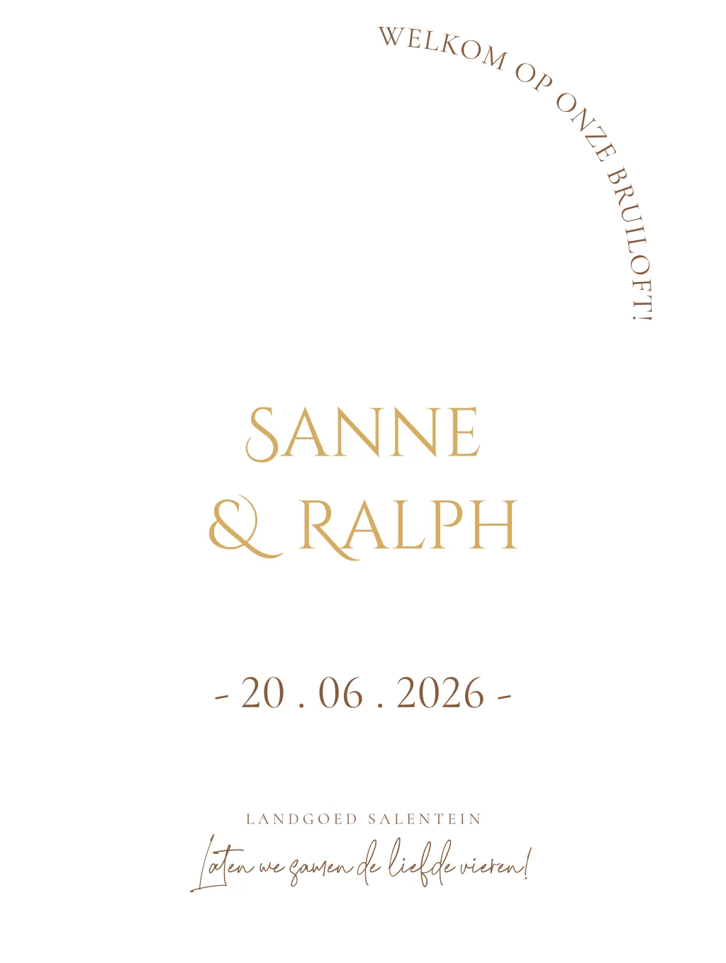 Mooi welkomstbord in wit met goud en een boogvorm tekst. Je kunt ook dit welkomstbord voor je bruiloft helemaal naar wens aanpassen in de online editor. Verkrijgbaar met bijpassende trouwkaart/save the date.
