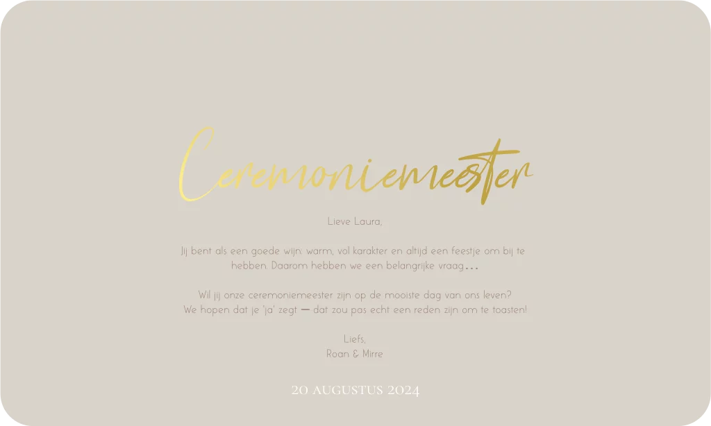 Geef jullie bruiloft een uniek tintje met een gepersonaliseerd wijnetiket! Perfect als originele save the date, een bijzondere manier om jullie getuige of ceremoniemeester te vragen, of als speciaal aandenken voor jullie gasten. Laat jullie namen, trouwdatum en een persoonlijke boodschap schitteren op een fles wijn – een stijlvol en blijvend gebaar.