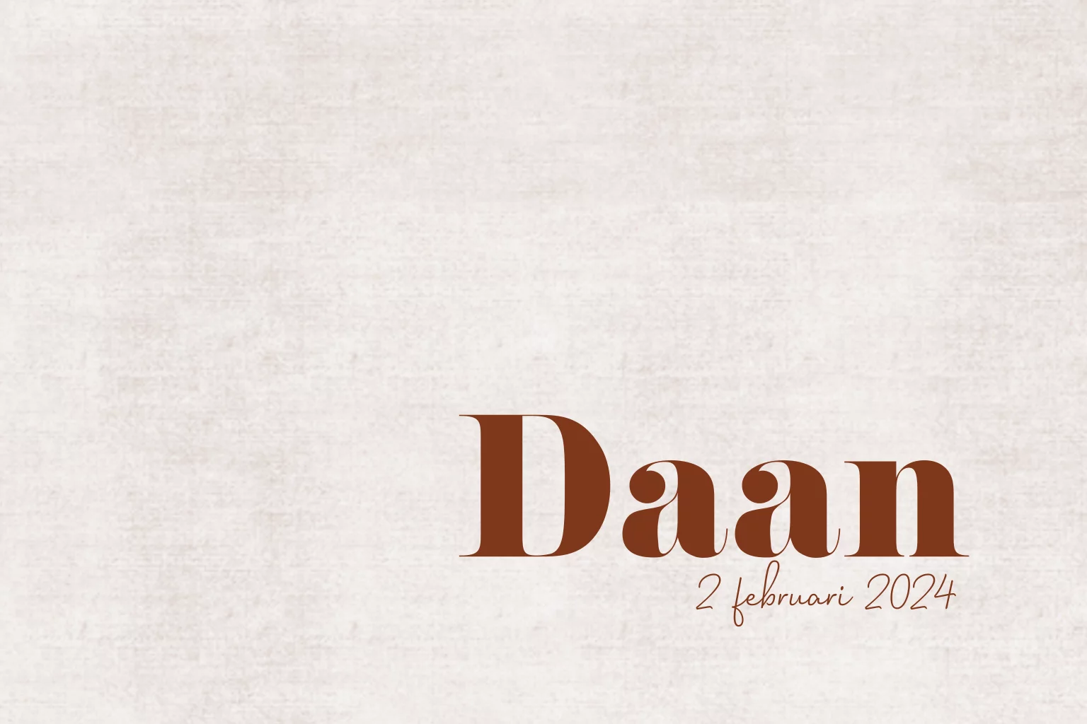 Lief sierlijk en simpel geboortekaartje voor een jongetje met een structuur achtergrond en roestkleur tekst. Linnenlook achtergrond.