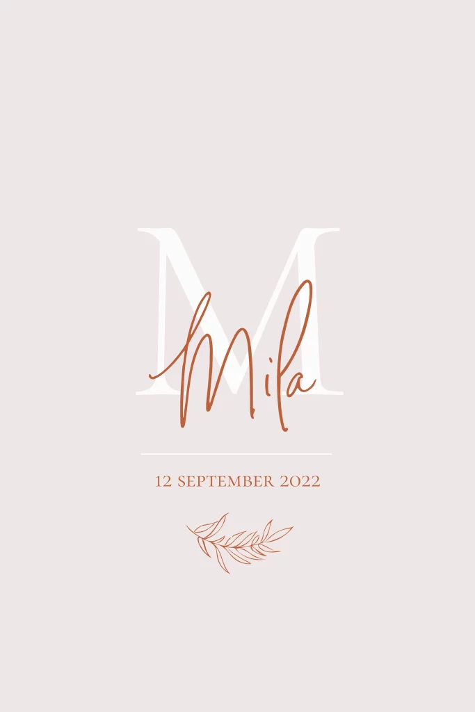 Lief geboortekaartje voor een meisje met een roze achtergrond en een initiaal. Onder de datum een takje.