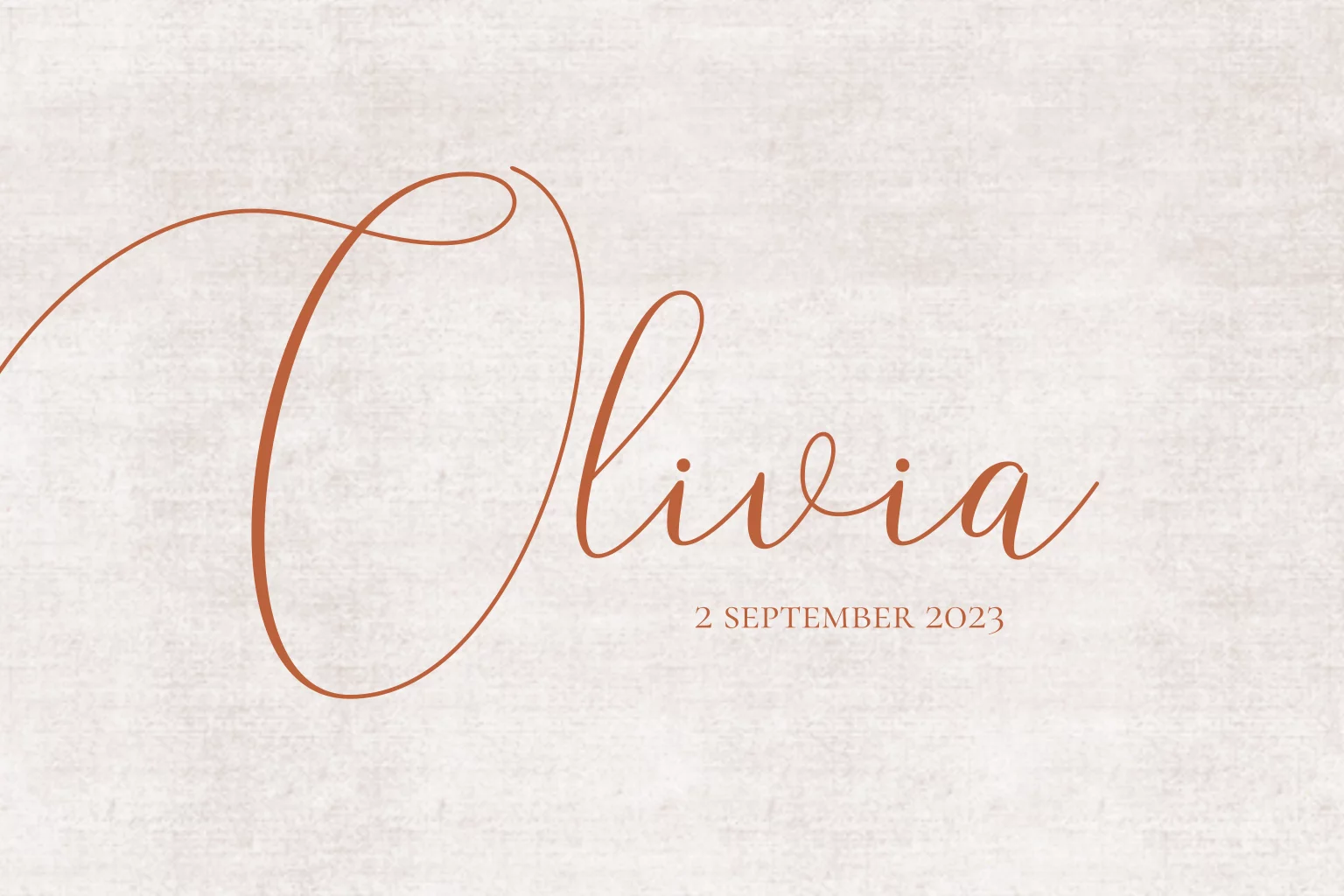 Lief geboortekaartje voor een meisje met linnenlook achtergrond in zand en roestkleur letters met grote naam.