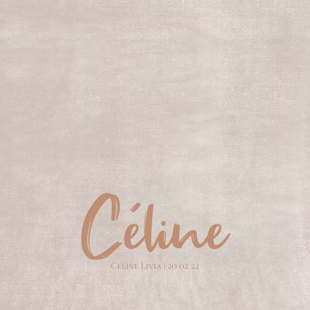 Linnenlook geboortekaartje voor een meisje in taupe kleur met roest naam. Meisjesnaam Céline.