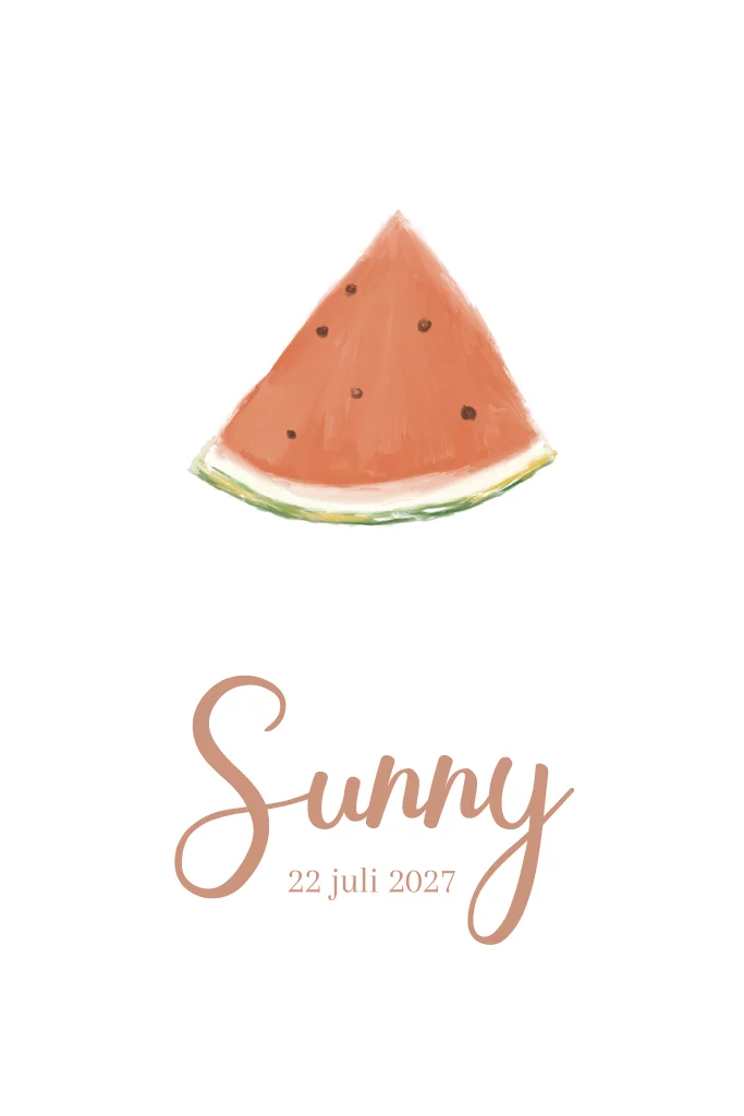 Zomers geboortekaartje voor een meisje met watermeloen. Pas deze zomerse geboortekaart naar wens aan in de online editor en bestel een proefdruk!
