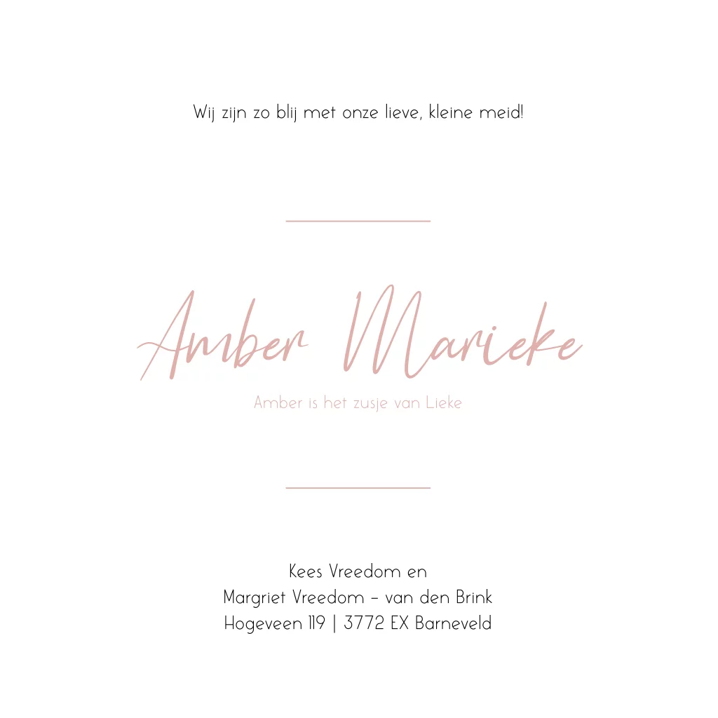 Minimalistisch geboortekaartje voor een meisje. Met roze sierlijk lettertype. Mooi op oud-Hollands papier