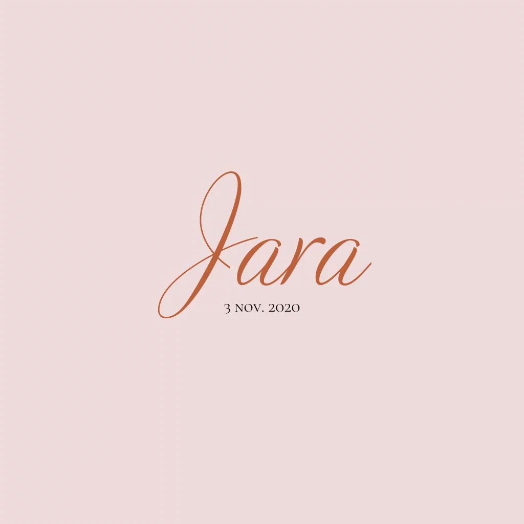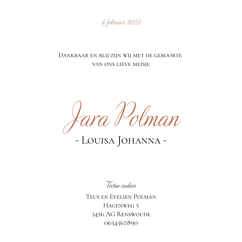 Lief en minimalistisch geboortekaartje voor een meisje met de naam in roestkleur. Pas het kaartje naar wens aan door de achtergrondkleur te wijzigen of iets toe te voegen!