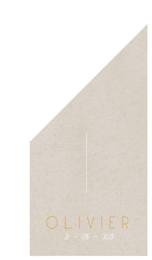 Geboortevlag in het formaat 60x60x120 met een zandkleur achtergrond en gouden tekst. Deze vlag past bij het kaartje van Olivier dat online staat!