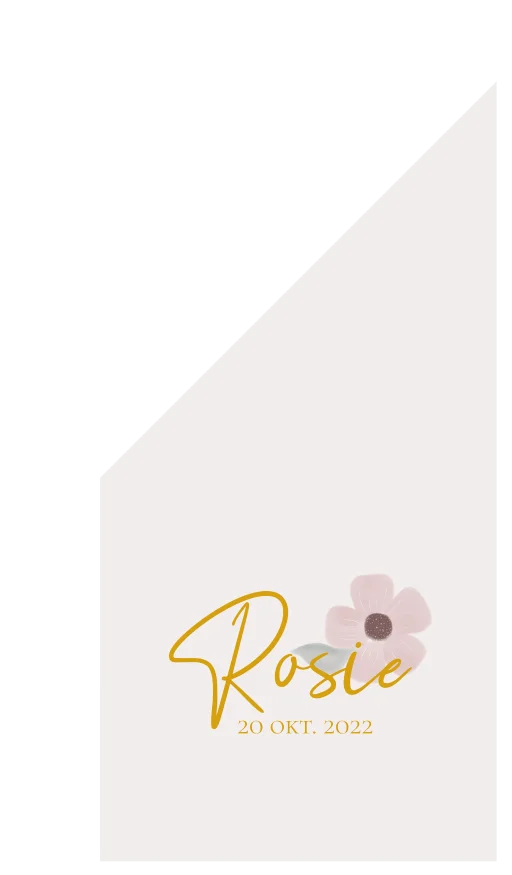 Geboortevlag in het formaat 60x60x120 met een roze achtergrond en gouden tekst. Voorzien van een lief bloemetje. Deze vlag past bij het kaartje van Rosie dat online staat!