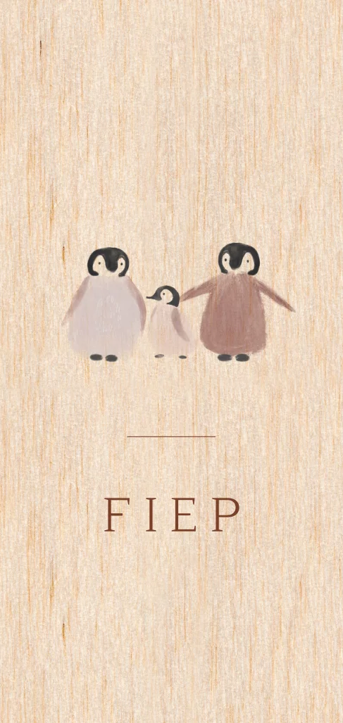 Geboortekaartje met pinguin familie voor een meisje. Gedrukt op hout met ronde hoeken!