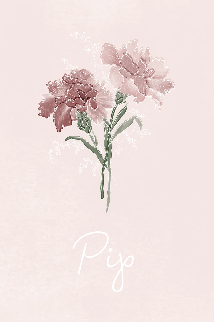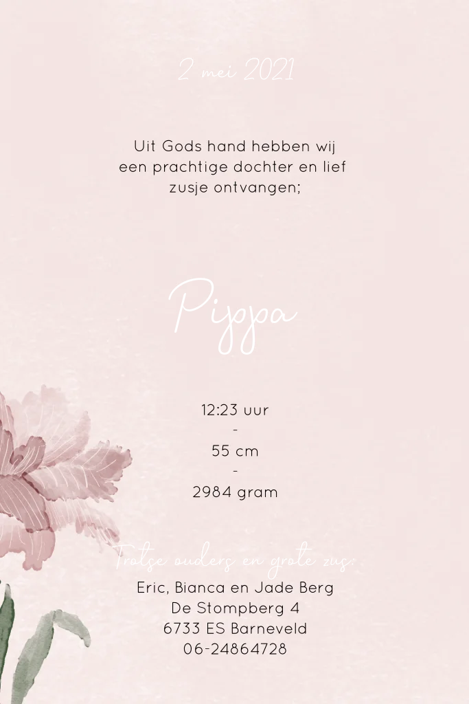 Geboortekaartje geboortebloem januari - anjer in roest en roze met een lijntje van goudfolie.
