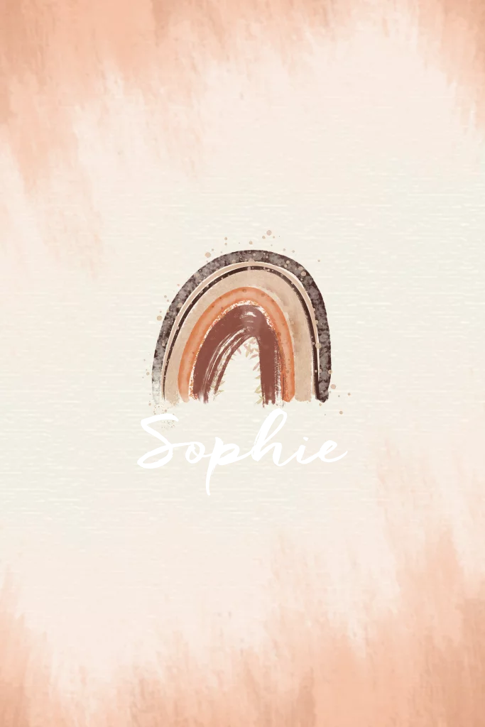 Geboortekaartje met regenboog voor een meisje. Het kaartje is in roestkleuren en oranje en heeft de naam in goudfolie.