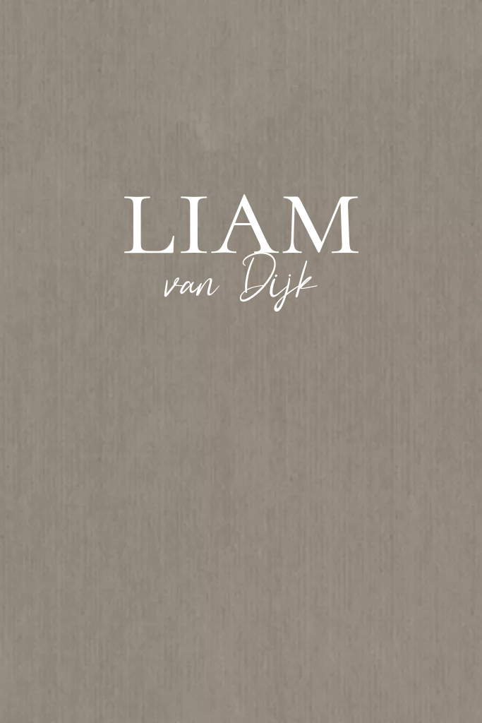 Lief geboortekaartje voor een jongetje met taupe achtergrond in linnenlook en goudfolie. Jongensnaam Liam.