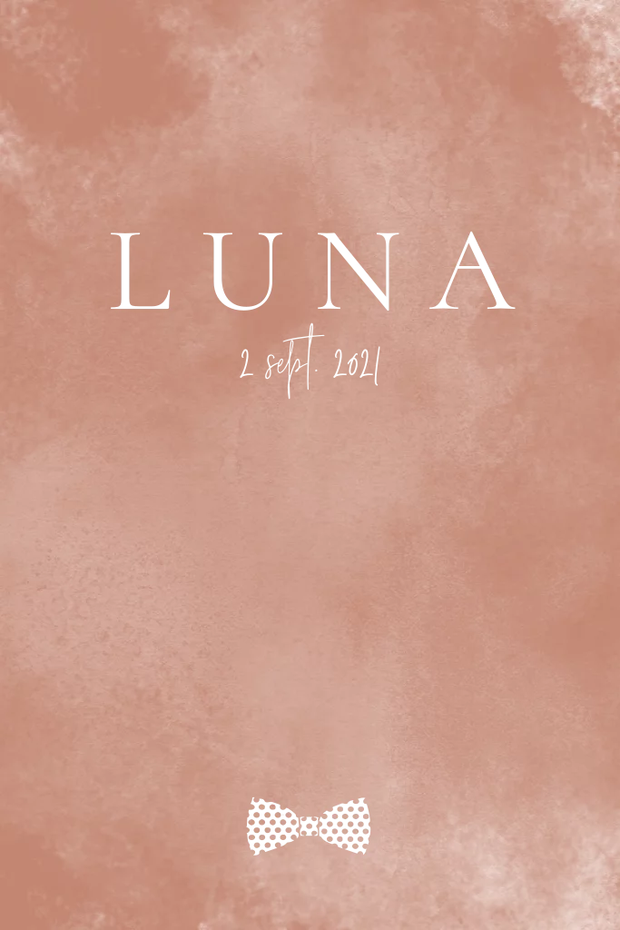Lief geboortekaartje voor een meisje met een terra roze gevlekte achtergrond, goudfolie en een strikje.