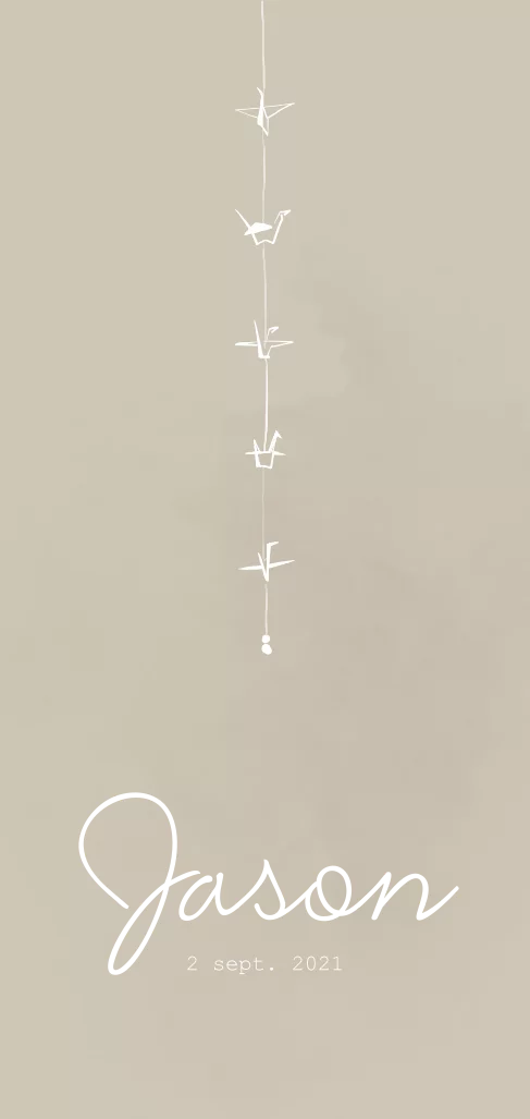 Lief geboortekaartje jongetje zandkleur met kraanvogelhanger