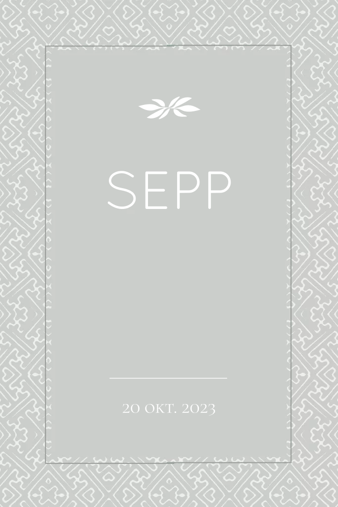Lief geboortekaartje met goudfolie en lichtgroene patroon achtergrond. Jongensnaam Sepp.