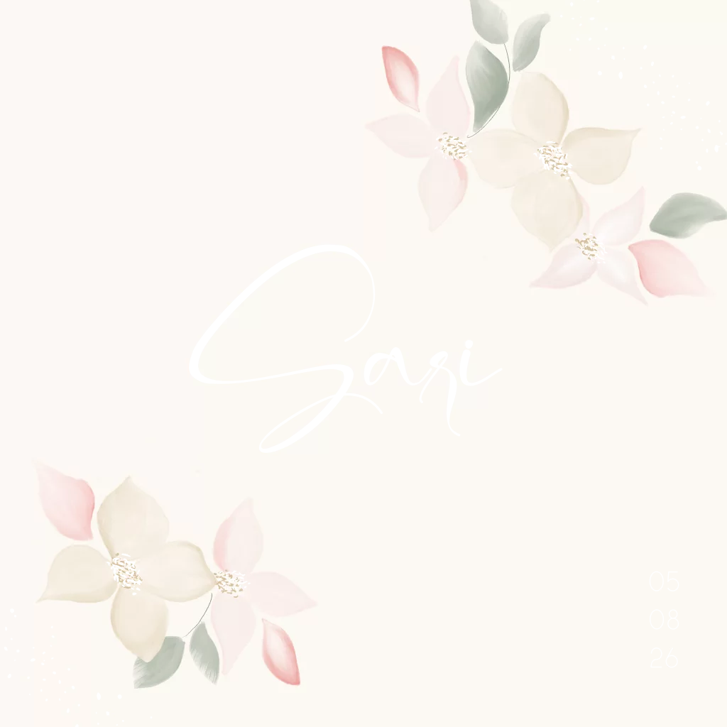 Lief geboortekaartje voor een meisje met zachtroze bloemetjes en goudfolie. Pas deze kaart naar wens aan in de online editor. Meisjesnaam Sari.
