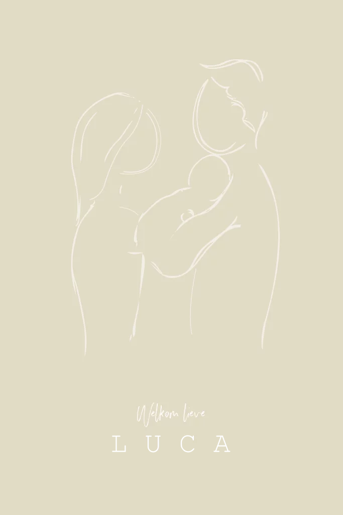 Geboortekaartje met een lijntekening van ouders met een baby. Naam in folie en een achtergrond in zandkleur. Pas de achtergrondkleur naar wens aan!